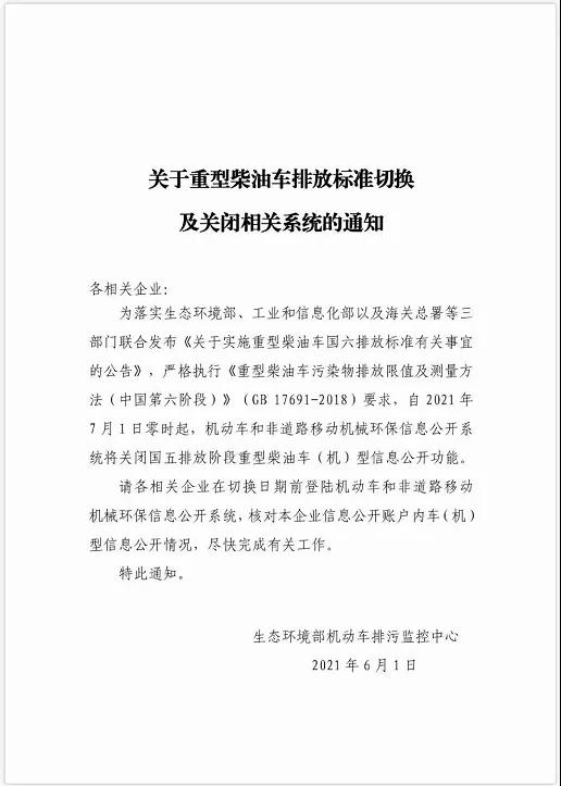 為落實生態(tài)環(huán)境部、工業(yè)和信息部以及海關(guān)總署等三部門聯(lián)合發(fā)《關(guān)于實施重型柴油車國六排放標準有關(guān)事宜的公告》,嚴格執(zhí)行《重型柴油車國六排放標準有關(guān)事宜的公告》,嚴格執(zhí)行《重型柴油車污染物排放限值及測量方法(中國第六階段)》(GB 17691-2018)要求,自2021年7月1日零時起,機動車和非道路移動機械環(huán)保信息公開系統(tǒng)將關(guān)閉國五排放階段重型柴油機車(機)型信息公開功能。