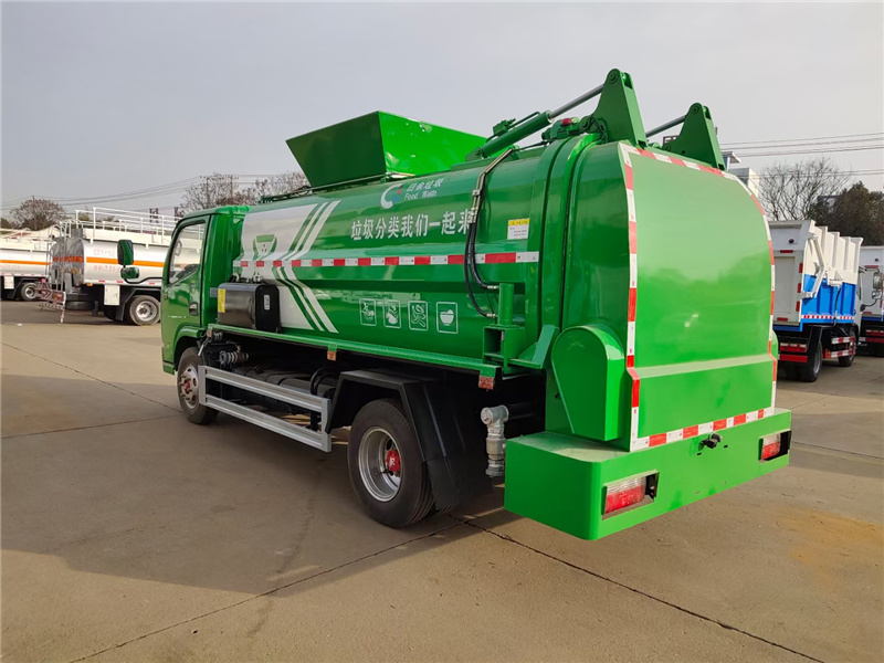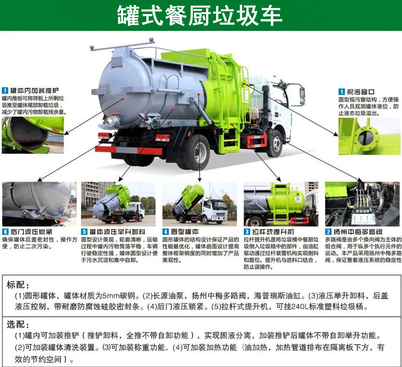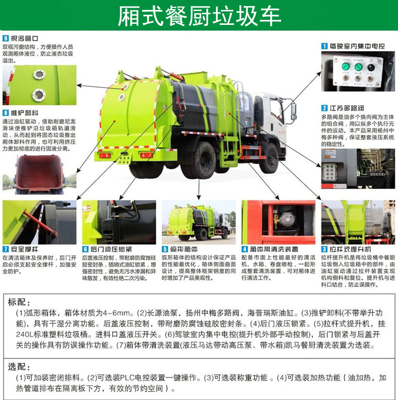 方罐式餐廚垃圾車:弧形廂體,箱體內(nèi)可實現(xiàn)固液分離,推鏟卸料,后蓋液壓開啟/鎖緊(帶耐磨橡膠密封條密封-后門關(guān)閉后滴水不漏),后門液壓鎖緊防誤操作功能,掛桶式提升機,可配合120升、240升標(biāo)準垃圾桶使用,清洗裝置(帶水箱、液壓馬達帶動高壓泵)。