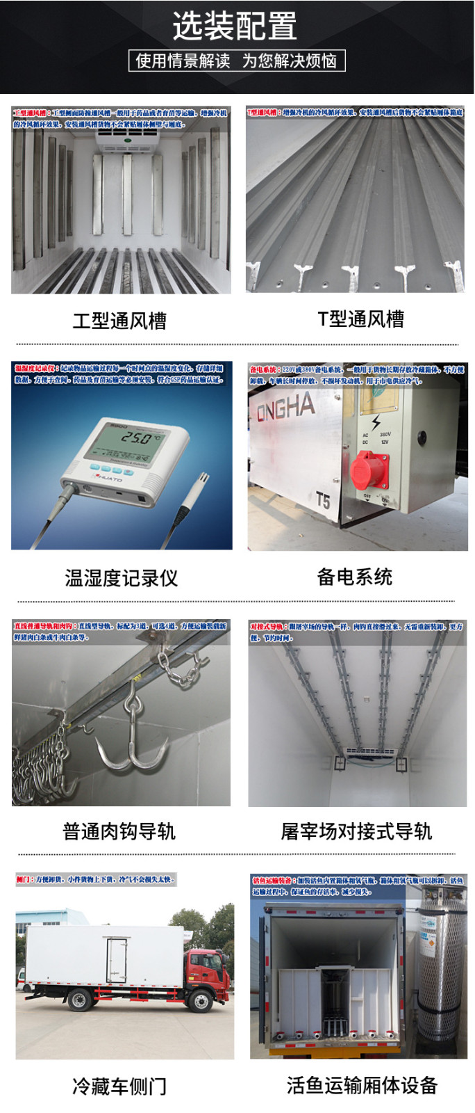 四、選裝配置:導(dǎo)軌肉鉤、T型通風(fēng)槽、右側(cè)開側(cè)門、溫度實(shí)時(shí)監(jiān)控帶打印裝置、裝海鮮廂體內(nèi)部面料必須選裝不銹鋼制造、可選裝12V-24V外接電源(車輛在停止時(shí),廂體通過外接電源進(jìn)行制冷)。