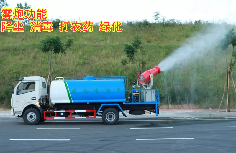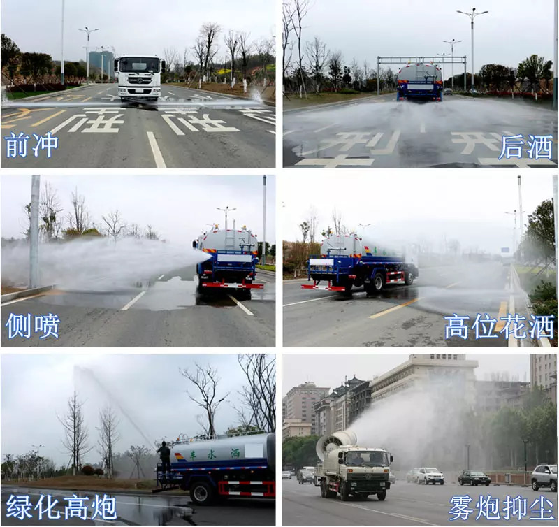 灑水車工作主要由發(fā)動(dòng)機(jī)帶動(dòng)變速箱,變速箱上安裝的取力器帶動(dòng)灑水車水泵產(chǎn)生動(dòng)力,將罐體內(nèi)部的水通過(guò)管路噴灑出去,水泵可自吸自排?筛鶕(jù)用戶需求選配抑塵霧炮。