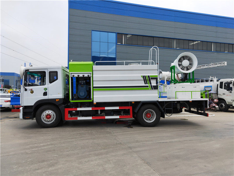 灑水車工作主要由發(fā)動(dòng)機(jī)帶動(dòng)變速箱,變速箱上安裝的取力器帶動(dòng)灑水車水泵產(chǎn)生動(dòng)力,將罐體內(nèi)部的水通過(guò)管路噴灑出去,水泵可自吸自排?筛鶕(jù)用戶需求選配抑塵霧炮。